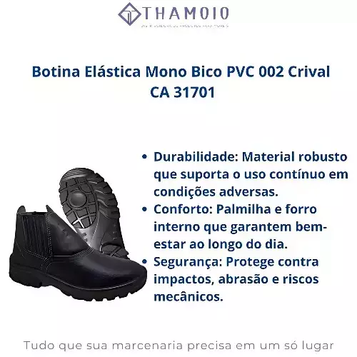 - Confecção em Couro Sintético. - Fechamento em Elástico. - Palmilha de montagem sintética, não tecido, costurada pelo sistema strobel. - Solado: Poliuretano Bidensidade - Costurada e Vulcanizada. - Acabamento: Vulcanizada (Obs: se tiver algumas rebarbas ou sensação de raspagem entre o couro e a sola não são defeitos pois o acabamento é pelo processo de Vulcanização). O que é botina vulcanizada? A vulcanização é um processo que consiste em levar a borracha do solado ao forno, processo em que a borracha sai quente e adere melhor na colagem, trazendo assim mais qualidade ao seu calçado. Qual é a importância da vulcanização? A vulcanização é um dos métodos, senão o mais importante, de cura da borracha. Esse processo garante à borracha propriedades excelentes, assim como DPC (Deformação Permanente por Compressão) muito baixa e elasticidade. Aprovado para: PROTEÇÃO DOS PÉS DO USUÁRIO CONTRA RISCOS DE NATUREZA LEVE E CONTRA AGENTES ABRASIVOS E ESCORIANTES. Observação: Calçado com resistência ao escorregamento em piso de cerâmica contaminado com lauril sulfato de sódio (detergente) (SRA). Garantia do vendedor: 30 dias